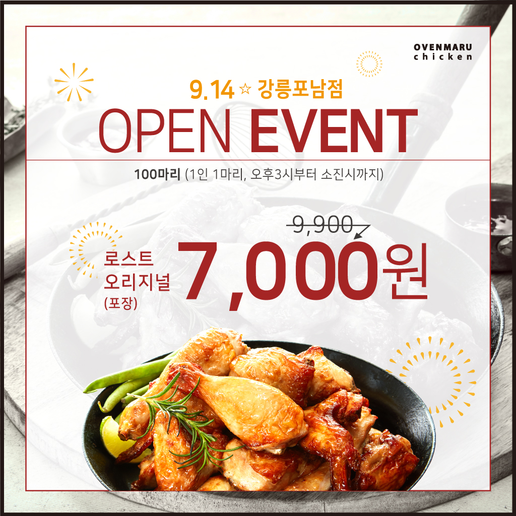 오븐마루치킨 강릉포남점이 9/14일 오픈합니다.